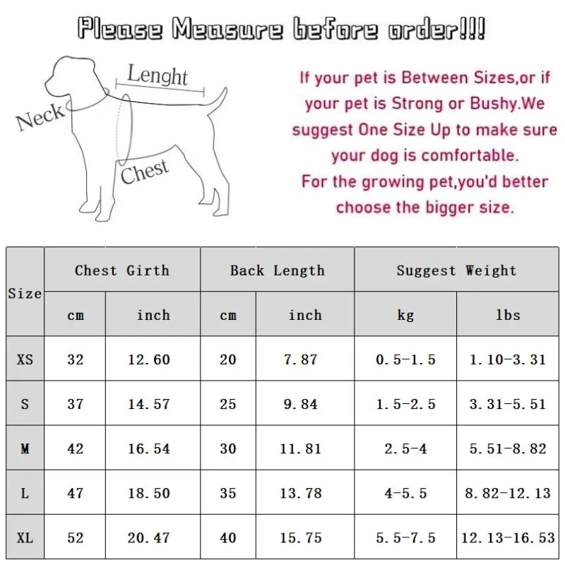 XL: Chest 52cm/20.47'' ; Length 40cm/15.75'' ; Suggest Weight 5.5-7.5 kg/12.13-16.53 lbs.
