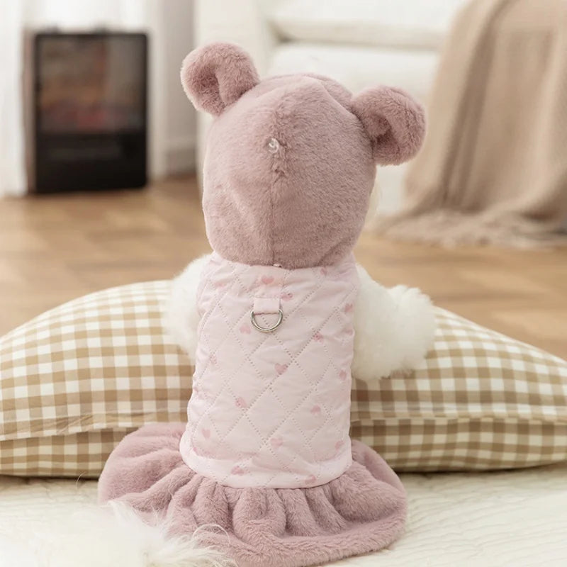 Characteristic:Design of Little Bear Ear Styling/The furry ears make people feel happy at first sight/The skirt is covered with heart-shaped patterns/Adding a romantic and warm atmosphere to the overall design/Soft plush fabric/Maximizes the comfort of pet clothing